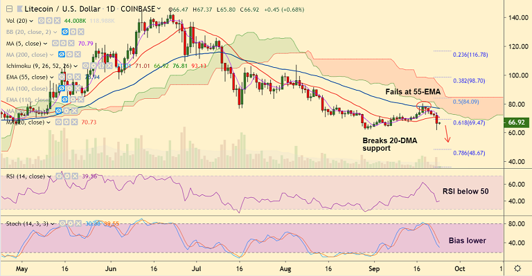 20-DMA is strong resistance at 70.73. Breakout above 55-EMA required for bearish invalidation.