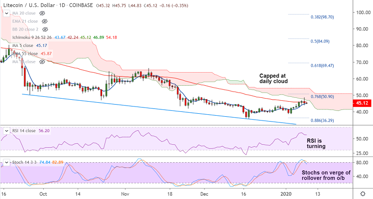 LTC/USD trades comatose around 5-DMA support at 45.16, bias is neutral.
