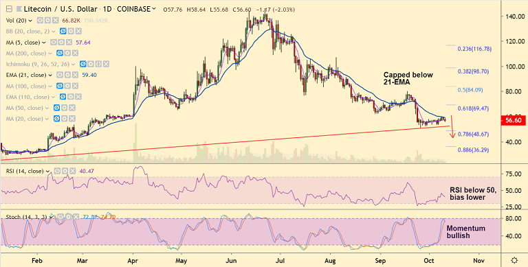 LTC/USD capped below 21-EMA, extends weakness for the 2nd straight session.