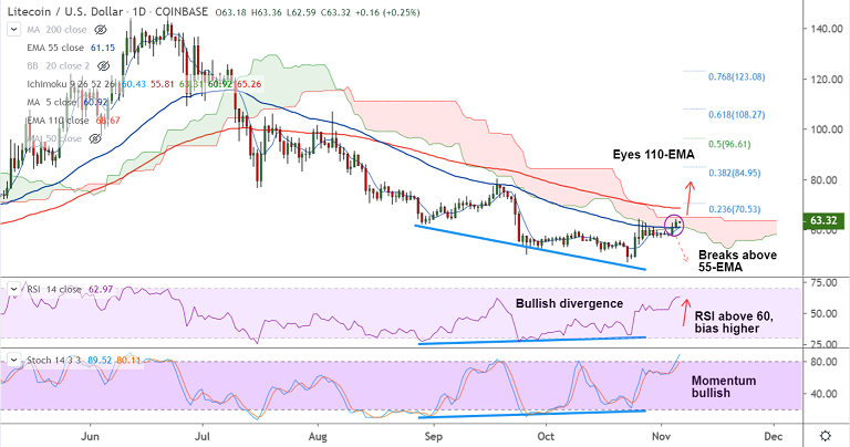 LTC/USD is extending 55-EMA break, edges higher for the 3rd straight session.