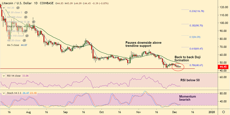Litecoin extends sideways grind, trades capped at 5-DMA (44.86).