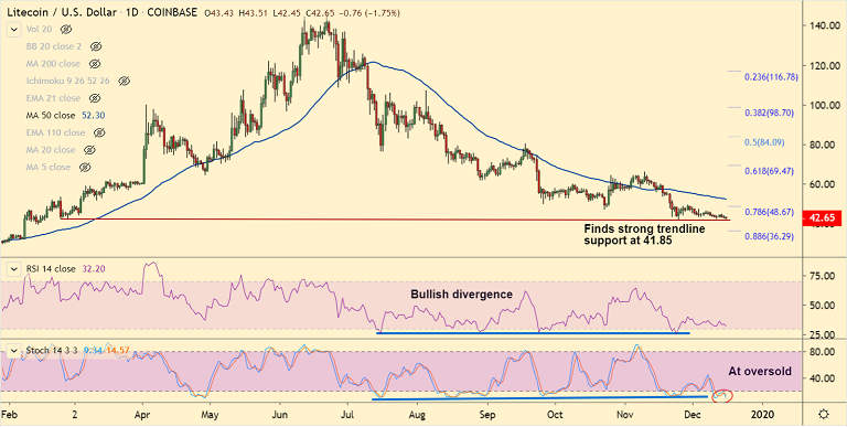 LTC/USD was trading 1.54% lower at 42.74 at 12:20 GMT, after closing 0.39% higher in the previous session.