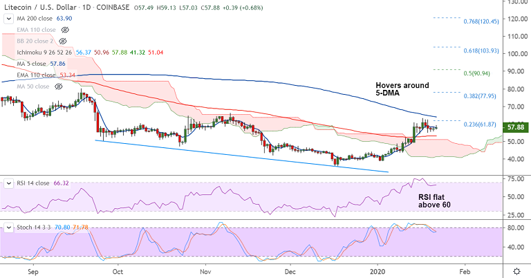 LTC/USD was trading 1.03% higher at 58.08 at around 09:50 GMT, bias is bullish.