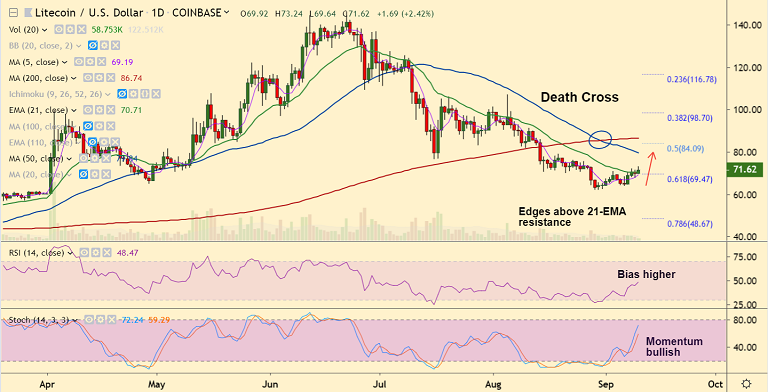 Litecoin is trading 2.95% higher on the day at 71.98 at 04:00 GMT, intraday bias is bullish.