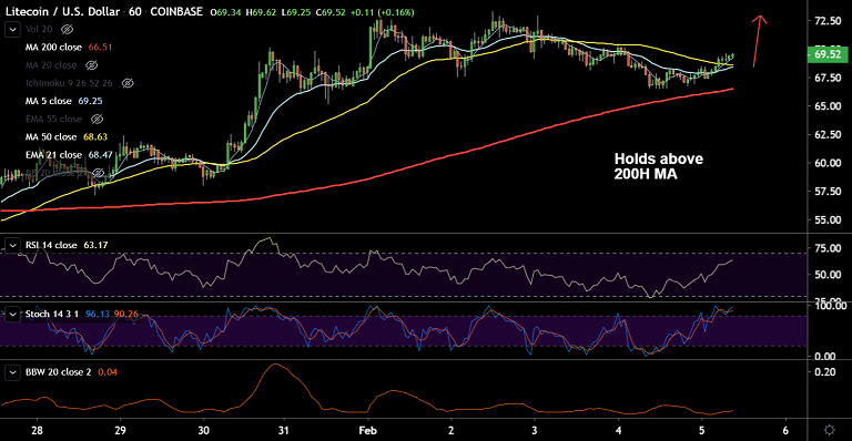 LTC/USD was trading 2.76% higher on the day at 69.71 at 09:45 GMT, after closing 2.46% lower in the previous session.