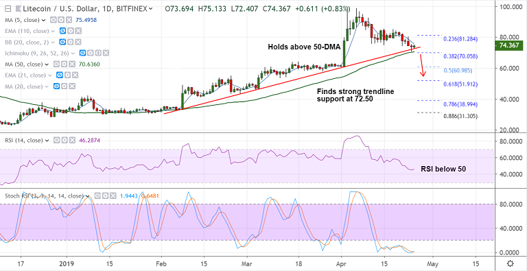 - Litecoin trades marginally higher on the day at 74.03 at 1150 GMT