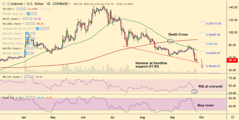 Litecoin trades in narrow range, was trading 0.69% lower on the day at 54.83 at 07:00 GMT.