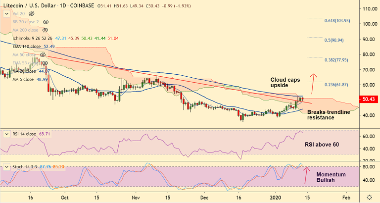 LTC/USD was trading 2.10% lower on the day at 50.39 at 11:00 GMT, bias remains bullish.