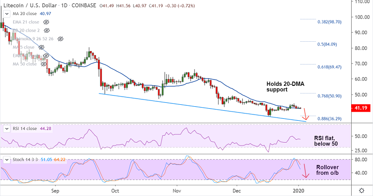 Price action remains capped between 21-EMA (41.99) and 20-DMA (40.97), bias remains bearish.