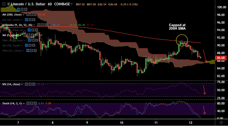 Litecoin recovery capped at 200H SMA (90.70), bias is still bearish.