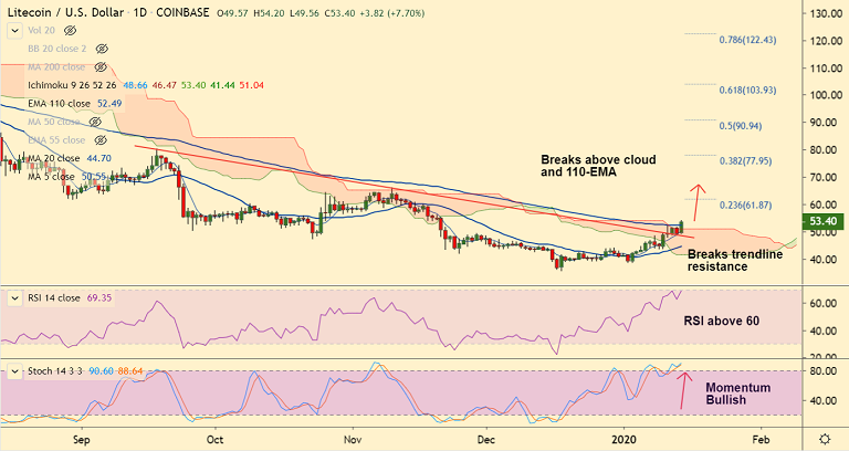 LTC/USD was trading 7.91% higher on the day at 53.50 at 07:00 GMT, bias has turned bullish.