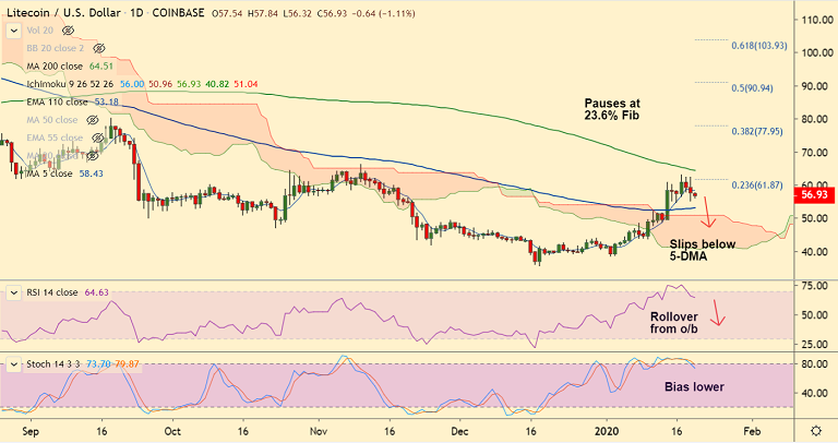 LTC/USD trades weaker for the 3rd consecutive session, slips below 5-DMA, bias is turning bearish.