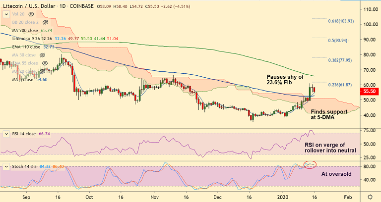 LTC/USD was trading 4.42% lower at 55.55 at around 10:15 GMT, bias remains bullish.