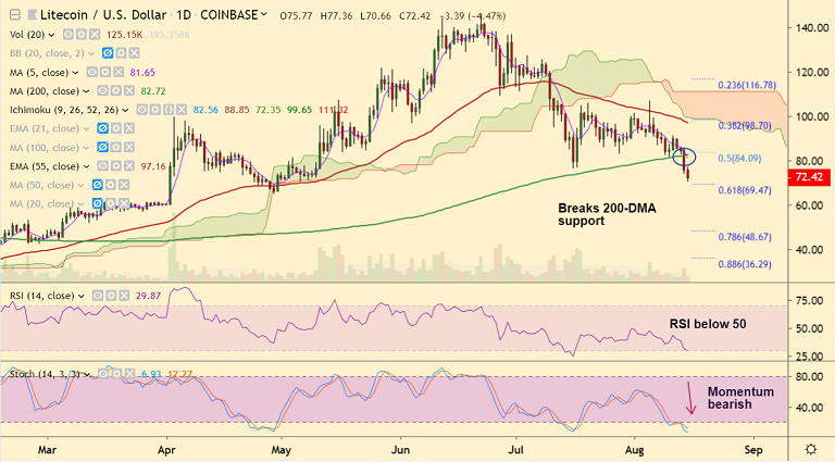Litecoin has breached below 200-DMA support at 82.72 and is trading 4.7% lower on the day at 72.29 at 06:55 GMT.