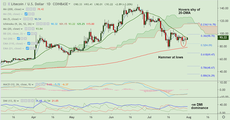 Price action has broken above 200-H SMA and 5-DMA, hovers shy of 20-DMA (93.84).