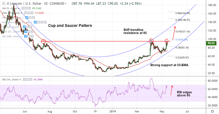 LTC/USD extends consolidation below $ 100 mark, finds stiff resistance at 95 (trendline)