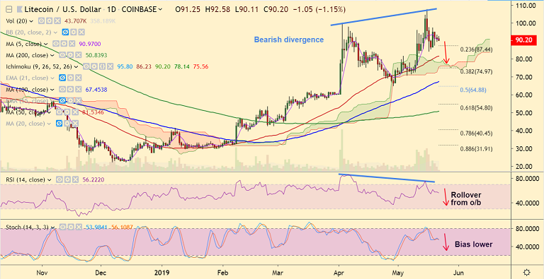 LTC/USD is extending weakness for the 3rd straight session, bias lower.