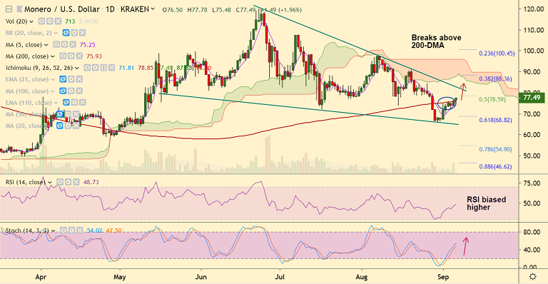 XMR/USD has shown a break above 200-DMA after many days of consolidation below.