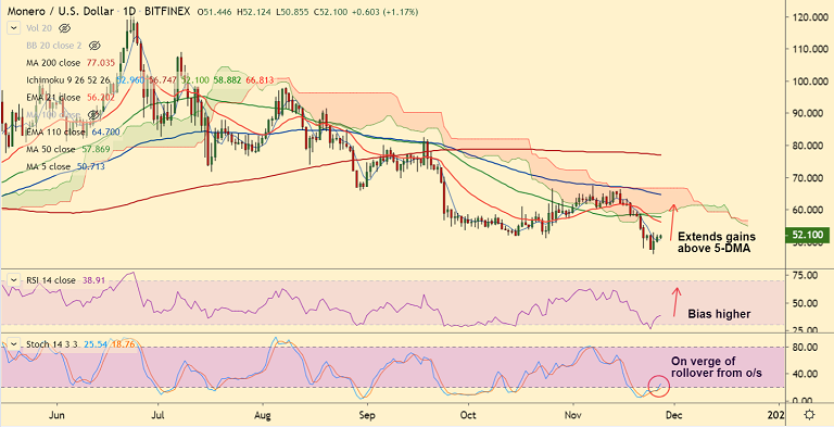 Monero is extending grind higher from 9-month lows at 46.10, bias turning slightly bullish.