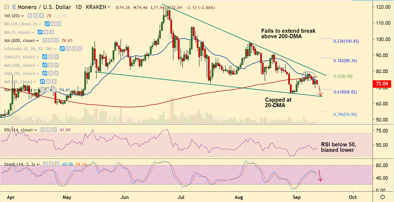 XMR/USD was trading 2.78% lower on the day at 72.10 at 04:00 GMT, bias is bearish.