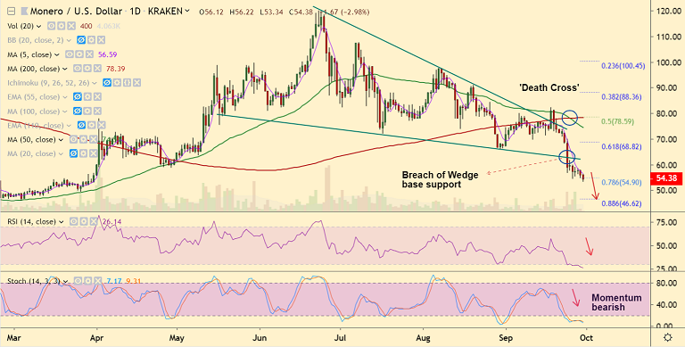 Monero (XMR) slips below 78.6% Fib retracement at 54.90, bias bearish.