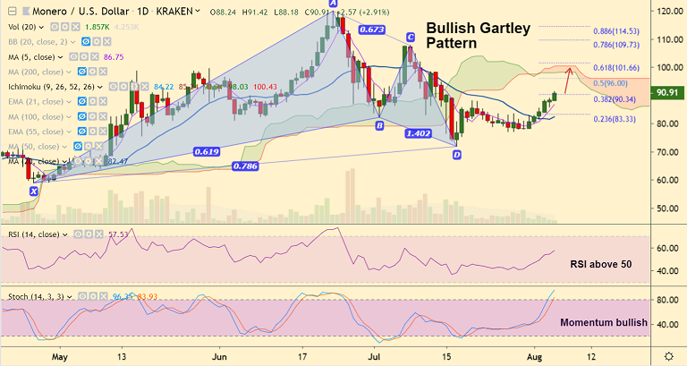 Monero spikes higher tracking gains in Bitcoin. XMR/USD was trading 3.51% higher at 91.44 at 04:05 GMT.