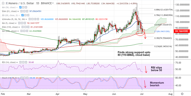 XMR/USD trades 5.67% lower on the day at 83.66 at 11:20 GMT.