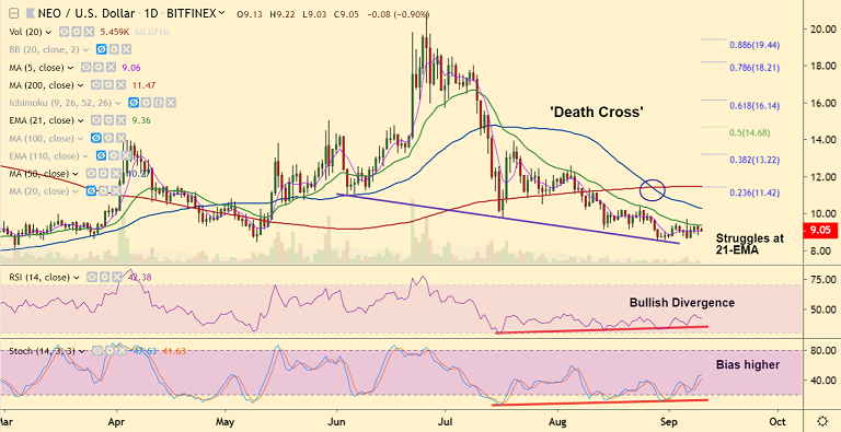 21-EMA is stiff resistance at 9.36. Break above could see extension of upside.