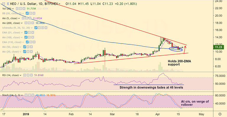 - Price action hovers around 21-EMA at 11.22, scope for test of 12.15 (trendline)