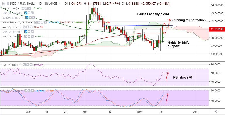 NEO/USD has paused upside at daily cloud top, bias remains bullish
