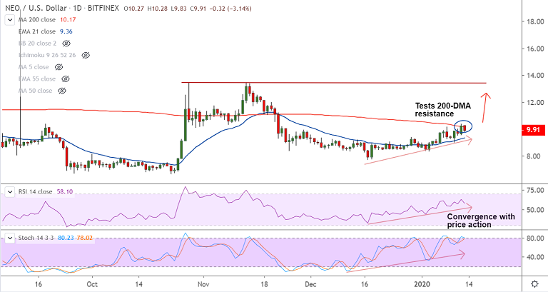 NEO/USD was trading 3.20% lower on the day at 9.90 at 10:15 GMT, bias slightly bullish.