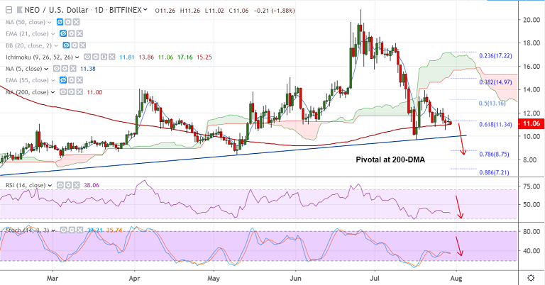 NEO/USD grinds sideways along 200-DMA support. Break below will open up downside.