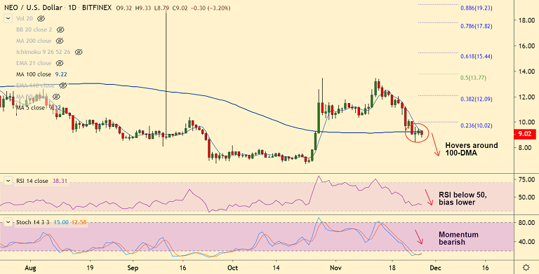 NEO/USD has resumed downside, halting 2 straight sessions of gains.