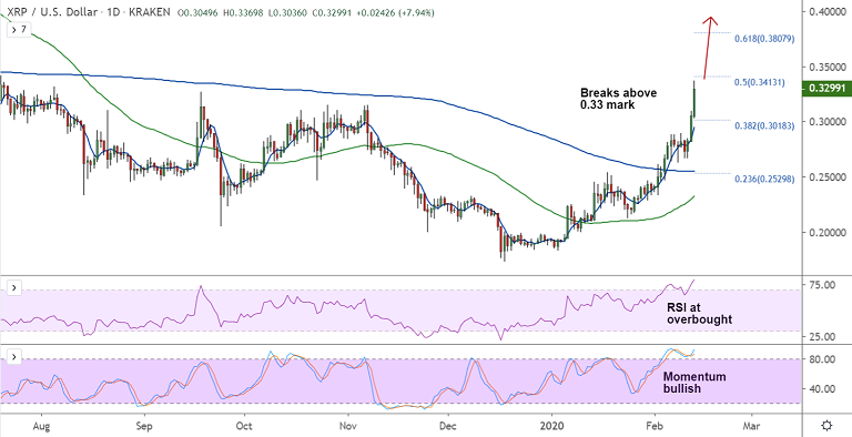 XRP/USD was trading at 0.3282 at around 05:30 GMT, erasing some gains from session highs at 0.3369.