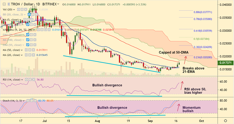 50-DMA offers stiff resistance at 0.017811. Break above will see further gains. Next bull target lies at 23.6% Fib at 0.020280