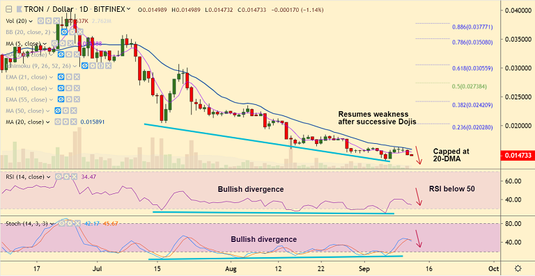 TRON (TRX) resumes weakness after rejection at 20-DMA resistance.