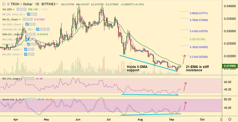 TRON (TRX) is extending recovery from 9-month lows at 0.0139, scope for further upside.