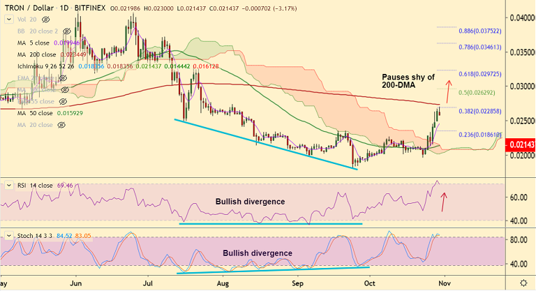 TRX/USD has paused bullish run just short of 200-DMA resistance at 0.023449.