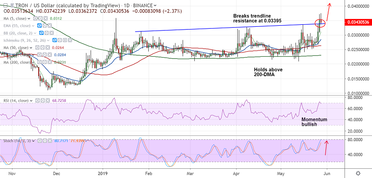 TRX/USD edged lower from new 10-month highs at 0.03513 hit on Monday.