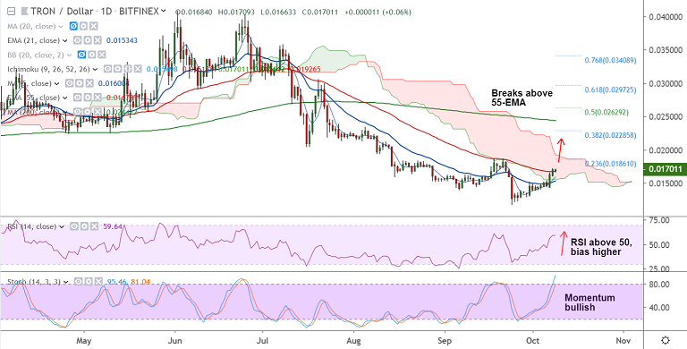 TRX/USD has broken above 55-EMA, was trading 0.06% higher on the day at 0.017010 at 10:10 GMT.