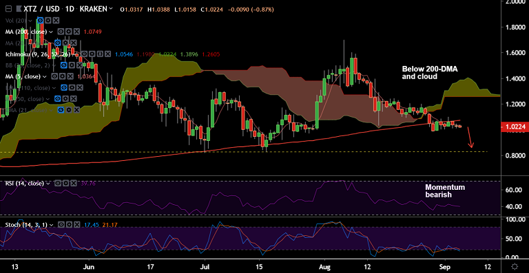 Tezos consolidates break below 200-DMA, trades 0.98% lower on the day at 1.0213 at 09:00 GMT.