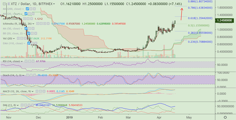 - XTZ/USD trades 7.14% higher on the day at 1.2450 at 1145 GMT