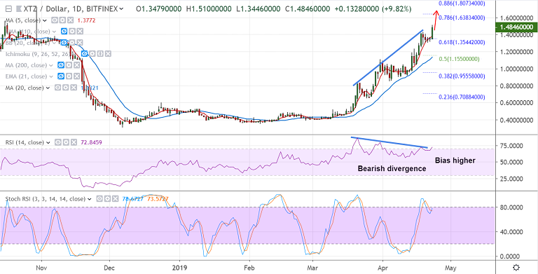 - XTZ/USD has hit new 6-month highs at 1.51, bias higher