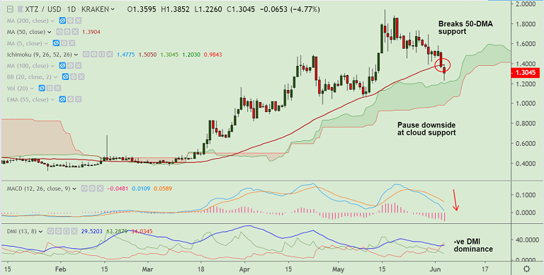XTZ/USD has breached 50-DMA support to hit fresh 3-week lows at 1.2260.