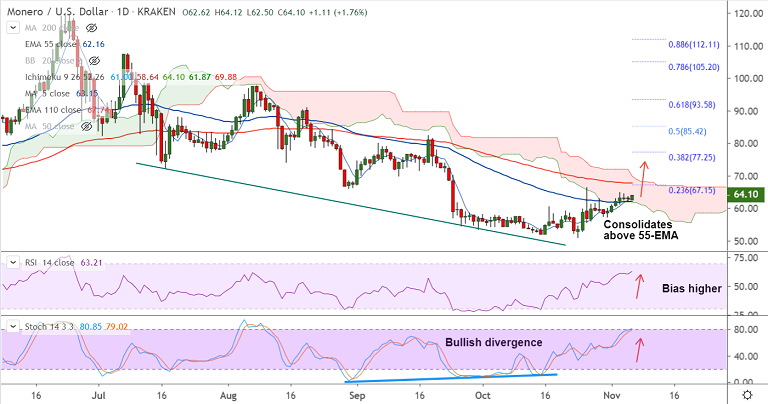 XMR/USD is trading 1.46% higher on the day at 63.91 at 06:30 GMT, bias turning bullish.
