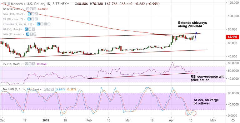 - Monero is extending sideways grind along 200-DMA