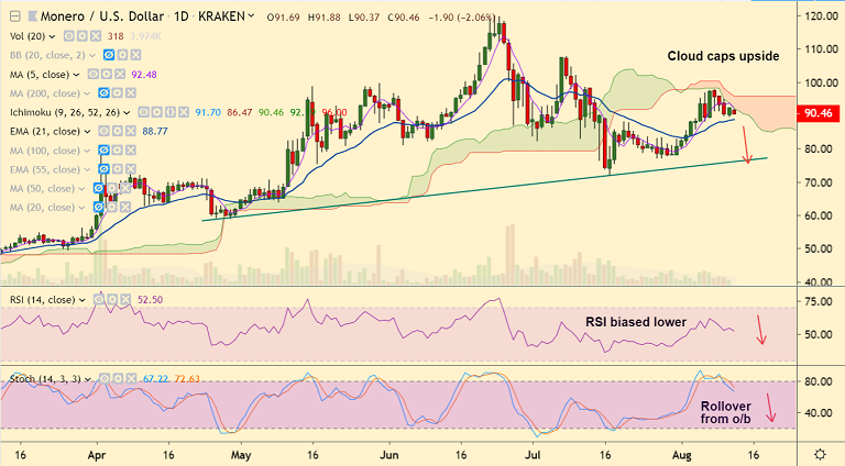 XMR/USD was trading 2.06% lower at 90.46 at 10:30 GMT, bias remains bearish.