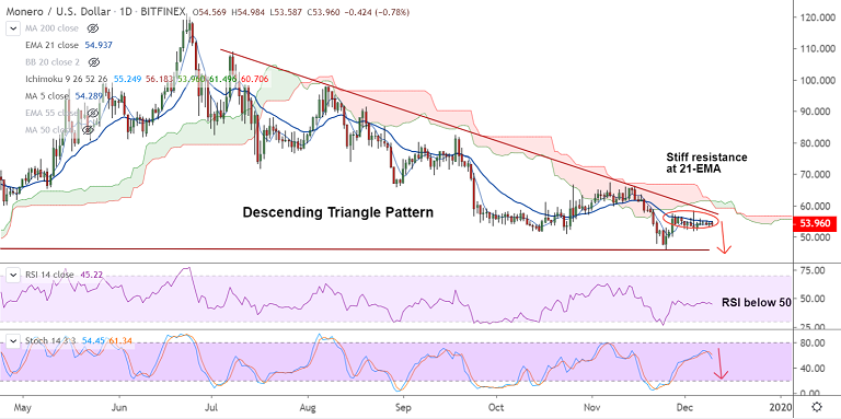 Monero is extending sideways grind as bulls unable to break stiff resistance at 21-EMA (currently at 54.943).