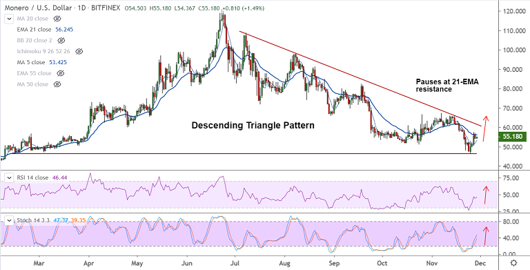 XMR/USD was trading 1.84% higher at 55.371 at 07:00 GMT after closing 2.77% lower in the previous session.