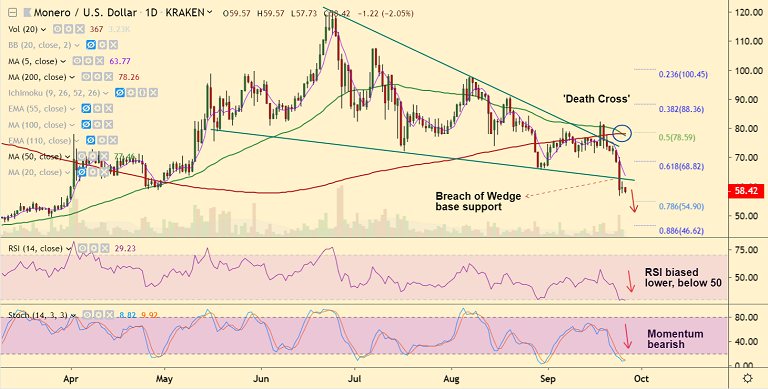 Monero (XMR) was trading 2.46% lower on the day at 58.17 at 09:00 GMT, bias is bearish.